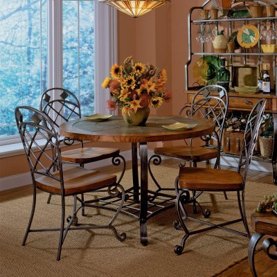 #The Riverside Harmony Round Dining Table Set combines elements of nature into a beautiful multi-textured design. The combination of rich solid wood and elegant quarried slate plus metal framework makes this set ideal for rustic or traditional dining areas and makes your seating arrangement into an instant focal point.The dining table is constructed of Mindi hardwood solids and veneers. Mindi is a dense open-grained wood that's similar to American Oak and highly valued in furniture-making due to its durability and its ease in accepting stain. It is stained a natural medium antique oak. The tabletop features a signature natural quarried-slate inlay in beautiful earth tones surrounded by a 1.75-inch-thick wood frame. The base of the table is made from hand-forged iron and beautifully scrolled; an aged pewter antique finish adds an extra touch.Also included in this set are four side dining chairs each constructed of a Mindi-wood-veneered seat and Mindi hardwood solids. The metal framework on the backs of the chairs matches that at the base of the table and is elegant and open in design; the chair's wood and metal are both finished to match those of the table.The table measures 48 diam. x 30H inches. The chairs measure 22W x 24.5D x 40.75H inches.About Riverside Furniture CorporationLocated in the heart of the Arkansas River Valley Riverside has been growing for more than half a century. Founded in 1946 Riverside began by making hand-crafted furniture for the post-World War II baby boom era. Since then it has created a wide selection of beautiful high-quality furniture items for every room of your home. Superior techniques home-grown materials and construction philosophies that focus on the beauty of the final product make Riverside one of the best suppliers of gorgeous furniture meant to last for generations. In the words of Herman Udouj the founder of Riverside "We want the Riverside name to be trusted for quality products that are an affordable value. It's just that