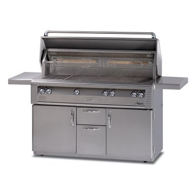 Alfresco ALX2-56BFGC 56 in. Jumbo Cart Model Grill . The product specialists at Hayneedle have been extensively trained by the manufacturer of Alfresco grills. These specialists know the product inside and out, top to bottom, front to back. They're here to help you with every step of your Alfresco grill purchasing process. Learn everything you need to know as you customize your grill island with drawers, doors, pizza ovens and more! Call 866-579-5183 to speak with a product specialist and start building your dream grill island today. Hours: Monday-Friday 9 a.m.-7 p.m. E.T.The Alfresco ALX2-56BFGC 56 in. Jumbo Cart Model Grill truly stands alone. This peerless jumbo grill creates a restaurant-quality kitchen anywhere you want. Stovetop prep, all-day smoke-outs, succulent rotisserie style roasting, and classic grilling are yours to command here. This 56-inch grill is made from 304 commercial-grade stainless steel with polished accents that look mesmerizing under that summer sun. Raise the hood and you'll find 998 square inches of actual grilling space plus a removable warming rack. Three high-temperature stainless steel main burners put out 82,500 BTUs so you can grill a large serving of meat and veggies thoroughly and quickly. But don't forget about the sear. Searing is an important process of grilling that most units on the market aren't even capable of delivering! Here, the specially designed 27,500 BTU Sear Zone flash-caramelizes the outside of your steak, effectively locking in unimaginable levels of flavor that would have been sweat away otherwise! And if you're a fan of flavor, then you're a fan of slow-cooked barbeque! This grill also features a 7,000 BTU dedicated smoker burner and oversized chunk drawer. In back, dual 15,000 BTU infrared burners heat a full rotisserie powered by a built-in motor. And let's not forget about sides - a 17,000 BTU side burner with wind-resistant recessed design lets you saute or boil your favorite appetizers and side dishes without having to run back inside to the kitchen