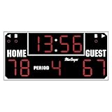 | ✚✚✚ Macgregor Ultimate Scoreboard Black Scores and/or times basketball, wrestling, volleyball, and other indoor sports 6' x 3'12" Ultra bright LED numerals for scores and clock, 8" LED numeral for periodScores to 99, clock displays 1/10 second during final minuteIncludes possession arrows and bonus lights Wireless controller included with 1 built-in horn BLACK in stock for immediate shipment. Also availble in other colors (see Item No: MSBULTC for further details)