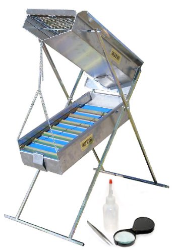 Drywashers are like highbankers but they do not use water, therefore, they are excellent gold mining tools for use in desert areas. GOLD BUDDY brand drywashers recover gold using three processes at the same time: Electrostatic concentration occurs because the high-velocity air flowing through the unit creates an electrical charge which attracts and holds gold. The same airflow holds the material in suspension allowing the heavier materials to sink under the riffles where it is caught. The Uni-bearing oscillating vibrator shakes the material at the same time, further helping the values to sink. Made in the USA and are designed to deliver years of service. Key features include: ? Hoppers & Recovery Boxes: Aluminum hoppers and recovery boxes are precision crafted from aircraft grade aluminum. The newly redesigned recovery box is completely electrically isolated so that the static charge builds quicker, stronger, and does not dissipate quickly. New one piece recovery tray is completely removable for easy cleanup. ? Grizzly, Legs and Riffles: The grizzly, legs, and riffles are made of zinc plated steel for years of durable rust free service. ? Folding Leg System: Gold Buddy drywashers all feature newly redesigned folding leg systems. The legs are plated steel thin wall square tubing and are shipped attached to the drywasher. ? Comes with a 3 inch air hose. Will run on any quality 3 inch, 2 cycle leaf blower - not included. ? Uni-Bearing Shaker Assembly: A simple one bearing shaker system is very effective. A metal dust cover keeps dust out of the sealed bearing for years of maintenance-free service. The steel fan blades are guaranteed to never need replacement! ? Working the Drywasher instructional DVD included ? Manufacturer 5 year limited warranty for defects in workmanship.Features • If you are interested in buying Gold Buddy Maverick Drywasher with Snuffer Bottle, Tweezers, Magnifier You can try to find full information and product details. • Reading reviews will give you a complete understanding of the pros and cons for the product. • If you try to find comparable items, and sometimes it helps to get the selection. • You can try to find arguments. • See the details for each product offerings and information. • You can try to find product features. • In general, I know the Internet in Gold Buddy Maverick Drywasher with Snuffer Bottle, Tweezers, Magnifier, or other material purchased the customer shops and stores, shipping, gift ideas, city deals, sales, coupons, online, new, holiday and reviews, cheap and low-cost interest daily deals, deal, Gold Buddy Maverick Drywasher with Snuffer Bottle, Tweezers, Magnifier special offers, Best deals, discount coupons, and more hot deals, great offers, last minute deals and the best buy various products including ...Additional Information |