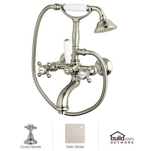 Rohl A2101XM San Julio Wall Mount Exposed Tub Filler Faucet with Hand Shower and Metal Cross, Satin Nickel . San Julio Wall Mount Exposed Tub Filler Faucet with Hand Shower and Metal Cross Handles Sometimes it's a good idea to embrace progress. Other times, remaining rooted in tradition is preferred. Rohl's San Julio collection does both. This traditional themed family of bathroom faucets and fixtures comfortably provides any bathroom with a look of universal appeal. It's combined with modern-day technological advances for safety and water savings. The Rohl Acqui collection features lead-free bathroom faucets, adhering to the new low-lead laws of California and Vermont. Additionally, these faucets are WaterSense-rated with an eco-friendly flow rate. Brass construction and five finish options round out Rohl's San Julio collection. Rohl A2101XM Features: All brass faucet body construction - weight: 13 lbs. Hand-machined from solid brass stock Industry leading, 1/4 turn lifetime ceramic disc valve Superior finishing process - chemical, scratch, and stain resistant Handle operated hand shower diverter Hand shower hose length: 39-3/8" Number of installation holes required: 2 Center-to-center distance between handle installation holes (faucet centers): 5-7/8" Wall-mounted installation 8 gallons-per-minute flow rate Metal cross handles included Overall height: 14-5/32" (measured from counter top to highest point of faucet) Spout reach: 3-5/8" (measured from center of faucet base to center of faucet outlet) Designed for use with standard U.S. plumbing connections Extra secure mounting assembly All necessary mounting hardware included Fully covered under Rohl's limited lifetime warranty Manufactured in New Zealand, Western Europe, and/or North America NOTE: Must order unions to complete purchase - AR00380Variations: A2101XM - This model A2101LM - Same model with metal lever handles A2101LP - Same model with porcelain lever handlesAbout Rohl: Excellence, durability, and beauty. Family values, integrity, and innovation
