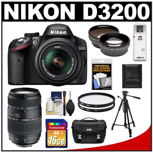 Nikon D3200 Digital SLR Camera & 18-55mm G VR DX AF-S Zoom Lens (Black) with 70-300mm Lens + 16GB Card + Case + Filters + Tripod + Telephoto & Wide-Angle Lens Kit