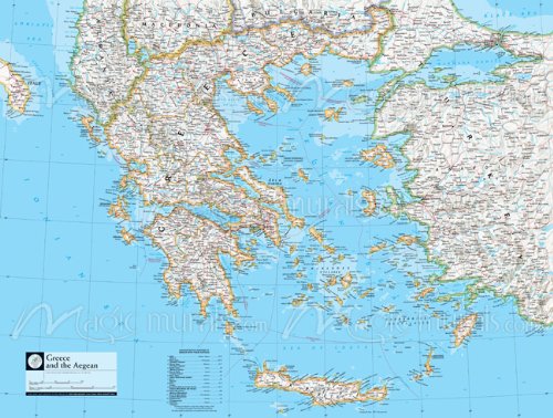 Map of Greece and Aegean Wall Mural End User License Agreement - I understand that in purchasing any mural by Magic Murals, I obtain no copyright rights or other intellectual property rights of any form in the content and may not duplicate or re-publish the photograph or artwork in the mural for any reason, including, but not limited to, commercial purposes. Commercial applications such as advertising or POP (point of purchase) displays are strictly prohibited. I further understand that in selecting any content and in adding text or other materials to such content, I in no way obtain copyright rights or other intellectual property rights in the content as joint copyright owner or otherwise.